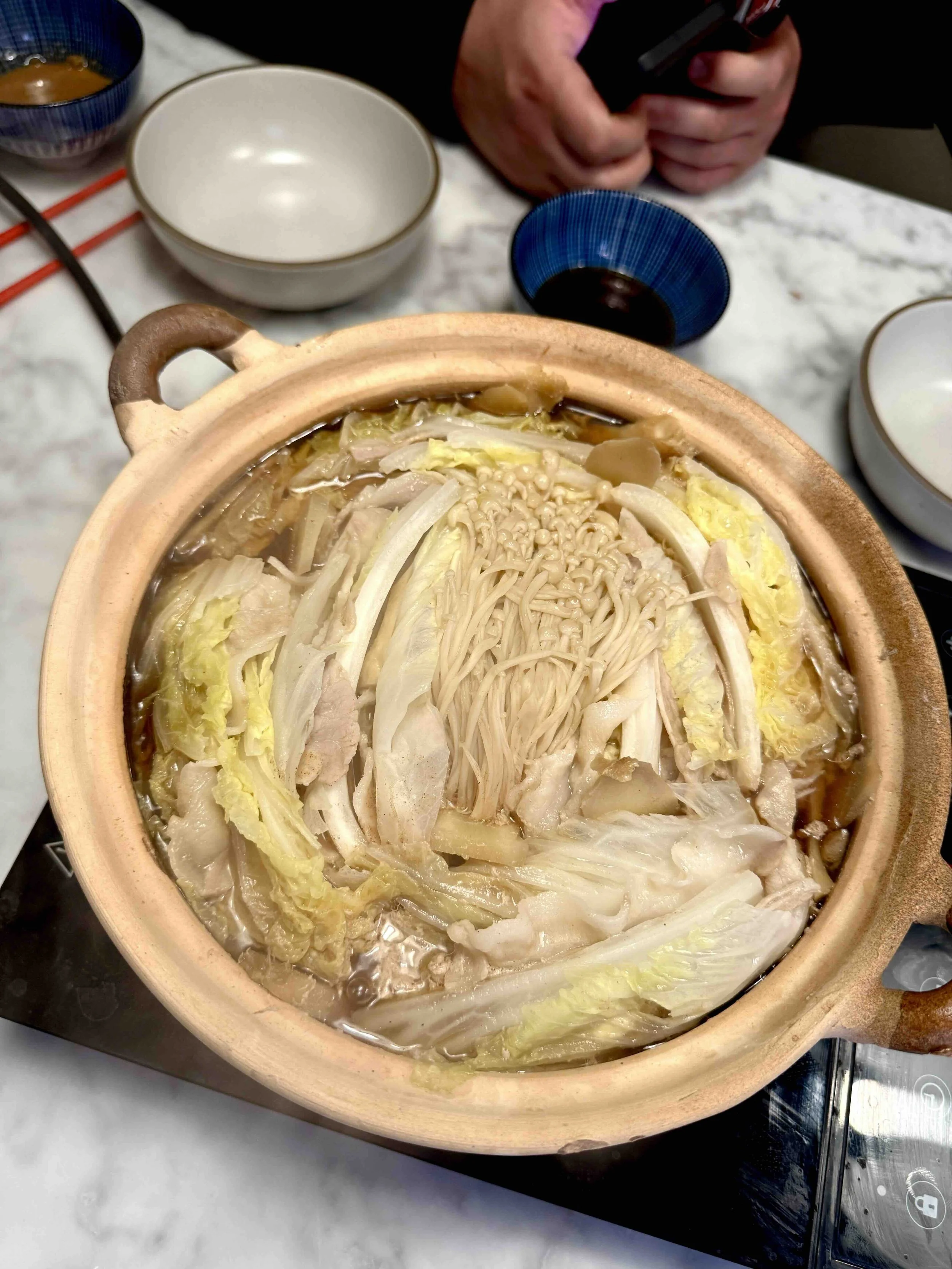 Sesame Sauce: Made by thinning sesame paste with a splash of mirin, a bit of soy sauce, and freshly chopped garlic. It's creamy, savory, and balances the lightness of the nabe beautifully.